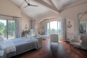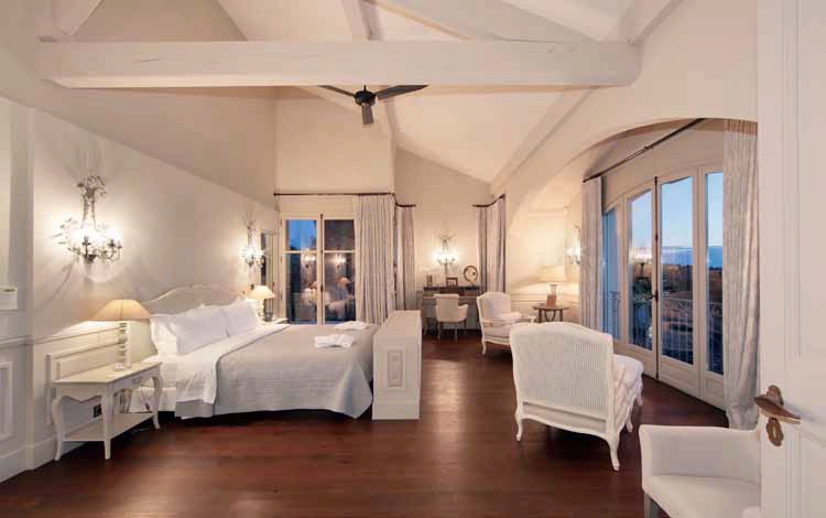 Spacious master suite, composed of very large bedroom with ensuite luxurious bathroom, dressing room and covered balcony; views to the sea, the Esterel and the Bay of Cannes, as well as Hotel du Cap Eden Roc.