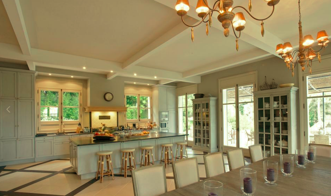 Kitchen and dining room combined in a very large living space of 80 m2, featuring fireplace and surrounded by French doors leading to the terraces and to garden. The fully equipped kitchen has been designed to enable a chef to prepare the meals comfortably. Elegant living – table and service accommodating 14 guests.