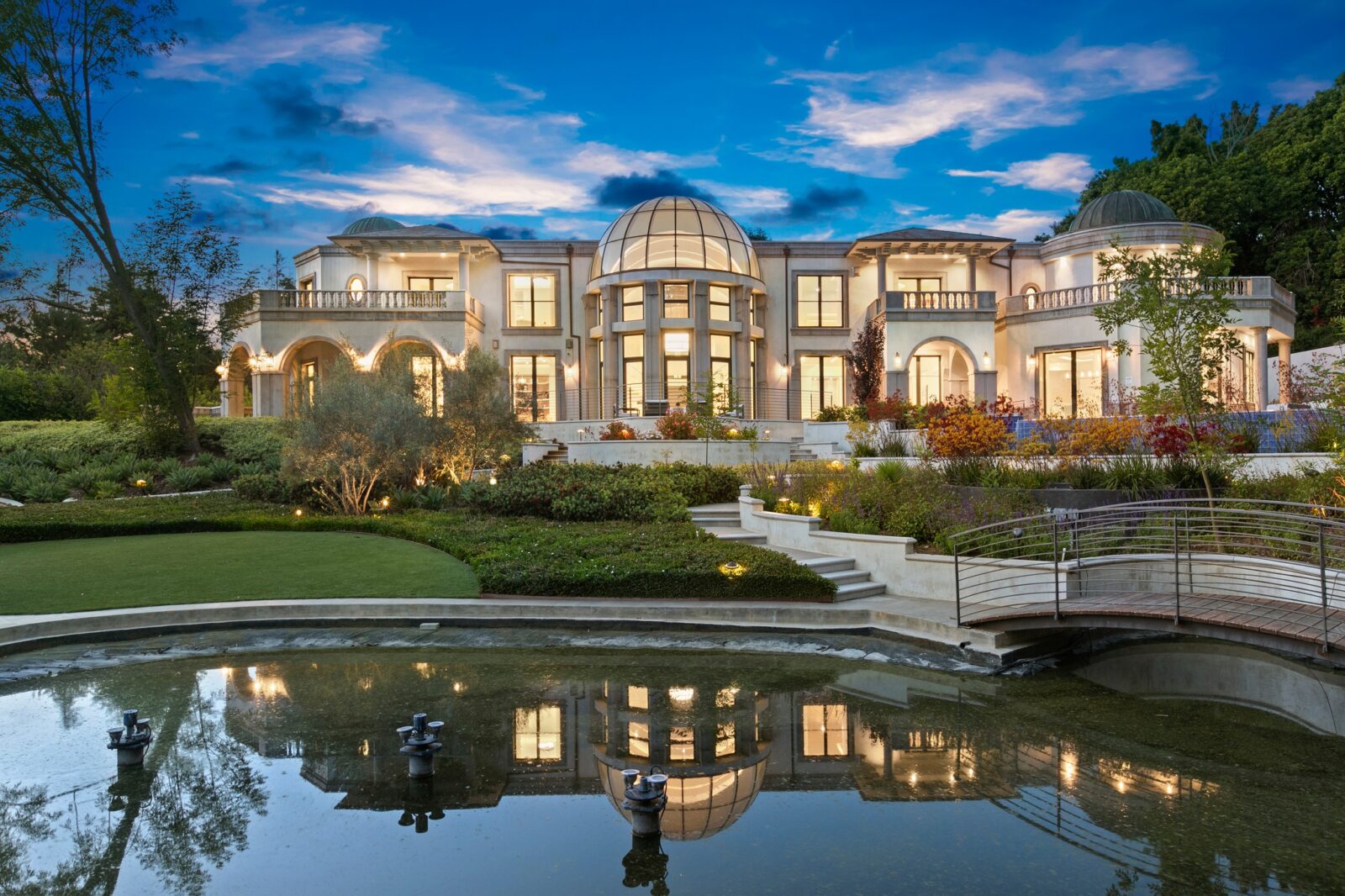 Covering roughly 15,000 square feet, the neoclassical estate features a dramatic array of domes, making for a palatial appearance. The interior equals the exterior’s grandeur, with a two-story foyer, glass atrium, and twin winding staircases. Additional highlights include a 2,900-square-foot guesthouse, a 13-car underground garage and an eight-seat movie theater. Sitting on 1.5 acres, the grounds encompass a tennis court, sizable pool and manicured gardens.